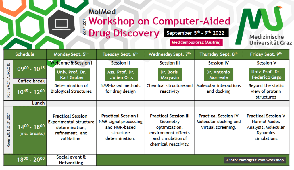 09:00-09:05 h \ WELCOME: Univ.-Prof. Priv.-Doz. Mag. Dr.rer.nat. Christian Wadsack (Dean of Doctoral Studies, Med Uni Graz), Univ.-Prof. Mag. Dr. ret. nat. Gilbert Reibnegger (Head of the Division of Medicinal Chemistry, Med Uni Graz)